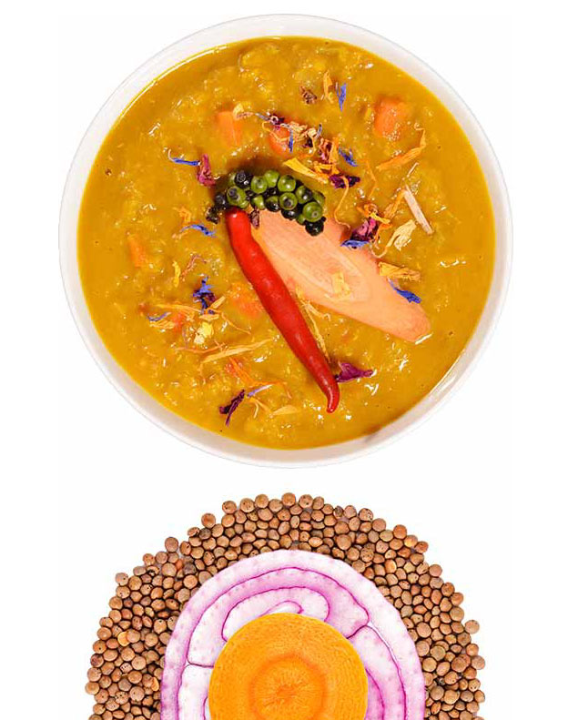 Wasser, Rote Linsen* (15%), Zwiebeln* (7,1%), Karotten* (6,5%), SELLERIE* (3,2%), Rapsöl*, Meersalz, Kurkuma*, Kumin*, Fenchel*, Lorbeer*, Kardamom*, Pfeffer*, Zimt*, Nelken*, Chili*