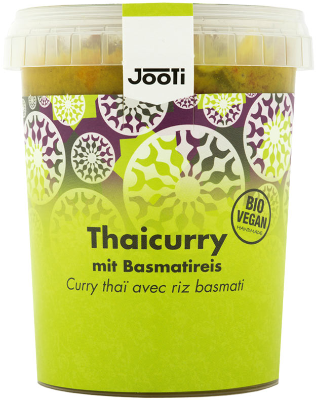 In dem veganen Bio-Thaicurry von JooTi wird die thailändische Küche zelebriert: Knackig frisches Gemüse, cremige Kokosmilch und duftender Basmatireis bilden gemeinsam mit Chili, Ingwer, Kreuzkümmel, Kurkuma und Zitronengras ein Reich der Sinne. Thailändischer Genuss als komplette Mahlzeit im Becher und das in bester Bio-Qualität. Erhitzen, umrühren, fertig! Geschmackvoller kann man aus einem Becher nicht löffeln.